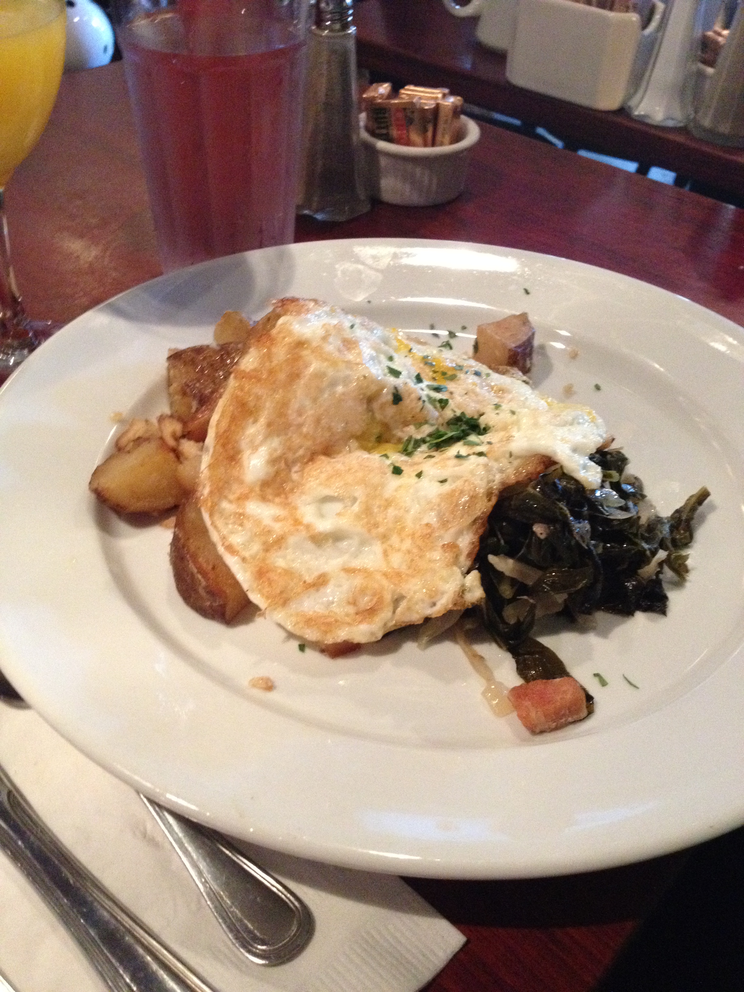My first exposure to this place was wandering over from the Armory where Talls and I were going to catch a charity music performance (which was awesome), and learning that there was at least an hour wait for dinner. Shit! We ended up having some tasty Thai food down the street instead, but obviously I had to look this place up. Their menu online looked fab AND they did brunch. Talls and I agreed that we would try again for brunch some time… and promptly forgot. We tend to be somewhat early brunchers for Sundays, and so a place that doesn’t open til 11am kind of fell off our radar. FINALLY we focused our sights back towards the Armory and got our asses (plus one friend’s ass!) over to Highland Kitchen. We were parked and in line at 10:45am and got a table as soon as they opened.